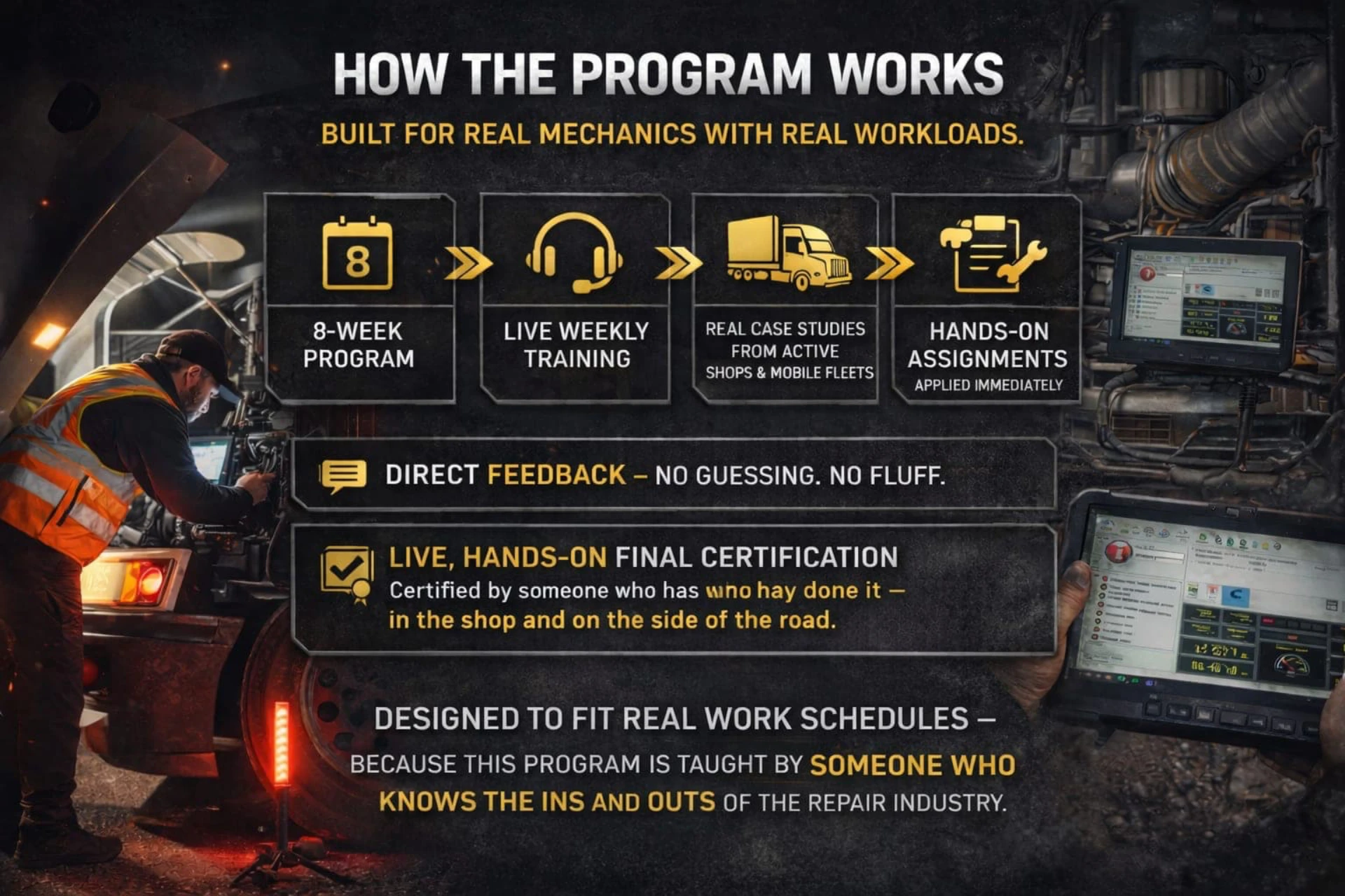 Built to fit real work schedules — because this is taught by someone who has owned and operated both in-shop and roadside.
